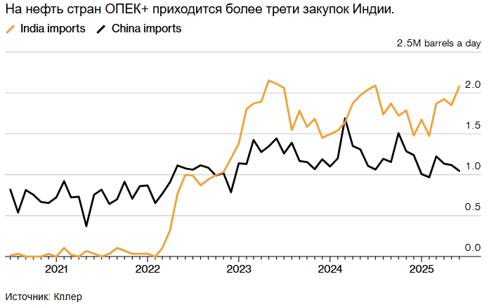 После начала конфликта на Украине в феврале 2022 года Индия стала крупным импортёром российской нефти. По данным аналитической компании Kpler, в этом году на страны ОПЕК+ приходится более трети всего объёма закупок, в то время как до начала боевых действий этот показатель был менее 1%. Импорт Китая также вырос.