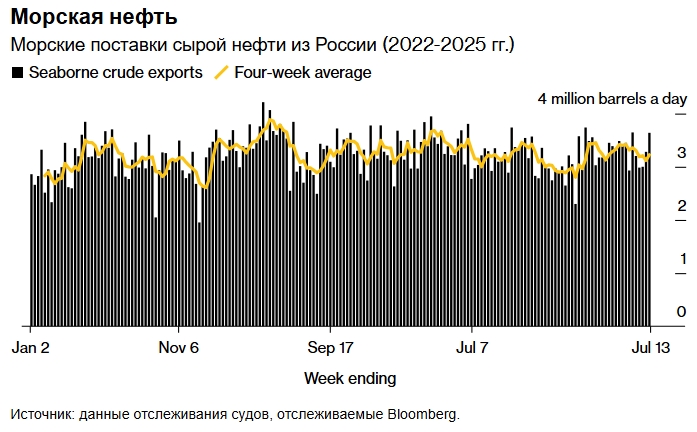 По данным мониторинга морских перевозок, собранным Bloomberg, за период с 6 по 13 июля объём морских перевозок сырой нефти достиг максимального значения с 15 июня. В среднем за четыре недели объём морских перевозок составил 3,23 млн баррелей в сутки, что на 3% больше, чем за аналогичный период, закончившийся 6 июля. Это позволило компенсировать снижение, наблюдавшееся на предыдущей неделе, и превысило средний показатель за год.