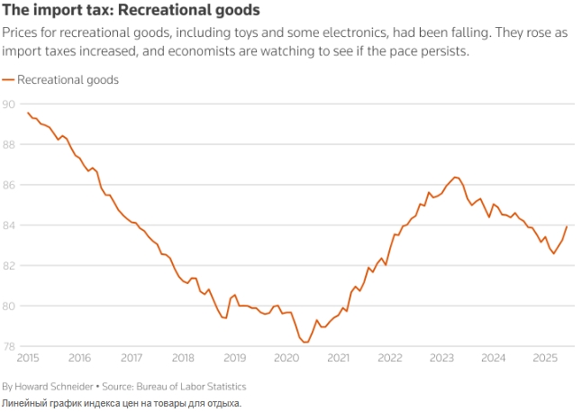 Шариф, глава Inflation Insights, сообщил, что в широкой категории товаров для досуга, в которую входят игрушки, аудио- и видеооборудование, часто импортируемое из Китая, наблюдается рост — в июне он составил 0,8%, что в два раза больше, чем за предыдущие два месяца.