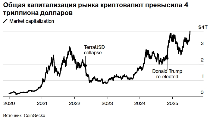 Стоимость всех криптовалют впервые в истории превысила 4 триллиона долларов. Этому способствовали рост цен на альтернативные цифровые активы и законодательные инициативы США в области регулирования рынка.