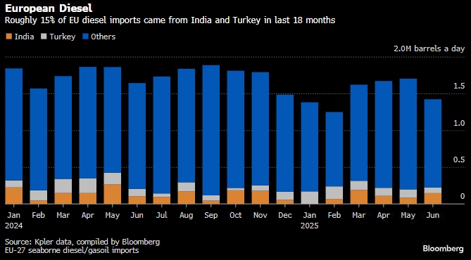 За последние 18 месяцев около 15% импортируемого ЕС дизеля поступало из Индии и Турции. А это производство из российской нефти.