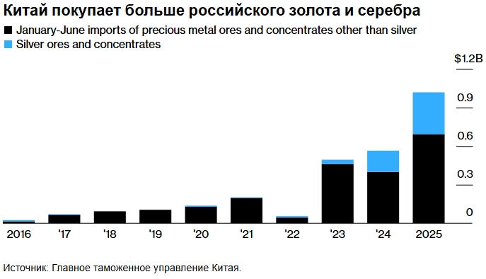 По данным, предоставленным таможенной службой Китая, импорт российских руд и концентратов драгоценных металлов, включая золото и серебро, в Китай вырос на 80% по сравнению с аналогичным периодом прошлого года и составил 1 миллиард долларов. Цены на слитки в этом году выросли примерно на 28%, что обусловлено увеличением геополитических рисков и торговой напряжённостью, а также закупками со стороны центральных банков и биржевых инвестиционных фондов.