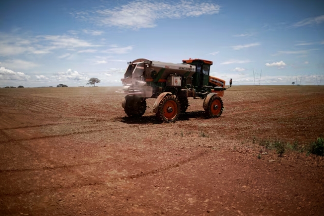 Сельскохозяйственный рабочий за рулём трактора, разбрасывающего удобрения на соевом поле недалеко от Бразилиа, Бразилия, 15 февраля 2022 г. REUTERS/Adriano Machado