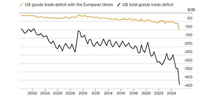 Торговый дефицит США с Европой растет. Источник: Bloomberg