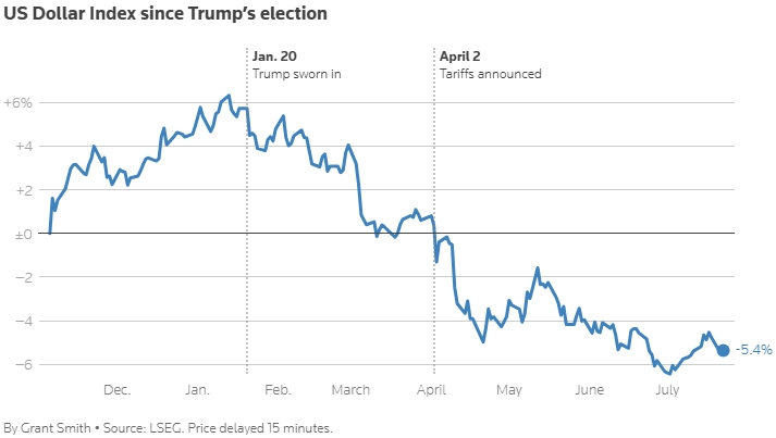 Однако, несмотря на это, курс доллара снизился примерно на 10% в этом году из-за изменений в торговой политике США и опасений по поводу роста государственного долга.