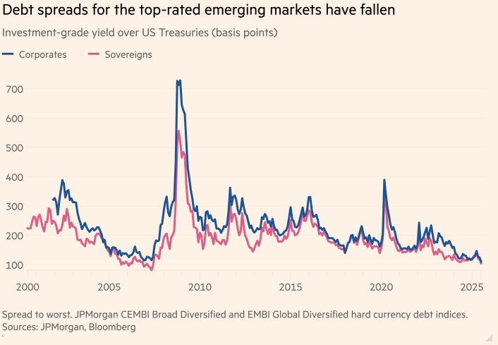 Инвесторы снизили стоимость заимствований для правительств и компаний развивающихся стран с высоким рейтингом по сравнению с развитыми рынками почти до самого низкого уровня со времён мирового финансового кризиса. Это произошло потому, что традиционные «тихие гавани», такие как казначейские облигации США, теряют свою привлекательность.