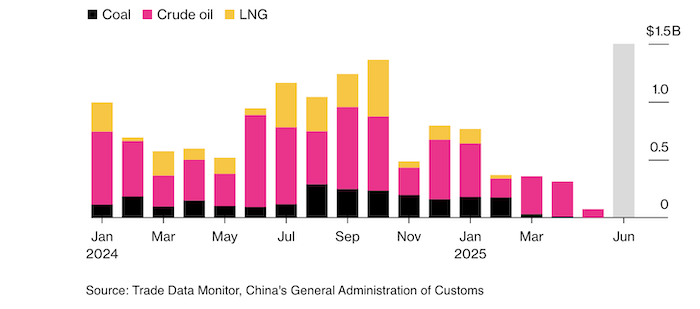 В июне Китай прекратил импорт угля, сырой нефти и СПГ из США. Источник: Bloomberg