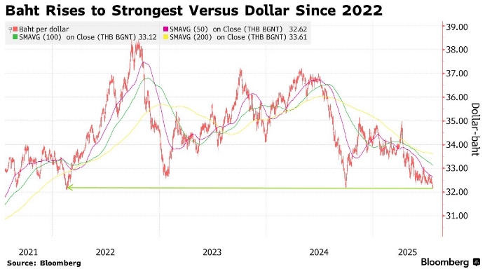 С начала года бат укрепился более чем на 6% благодаря растущему оптимизму по поводу торговых переговоров, возобновлению притока иностранных инвестиций и почти рекордно высоким ценам на золото.