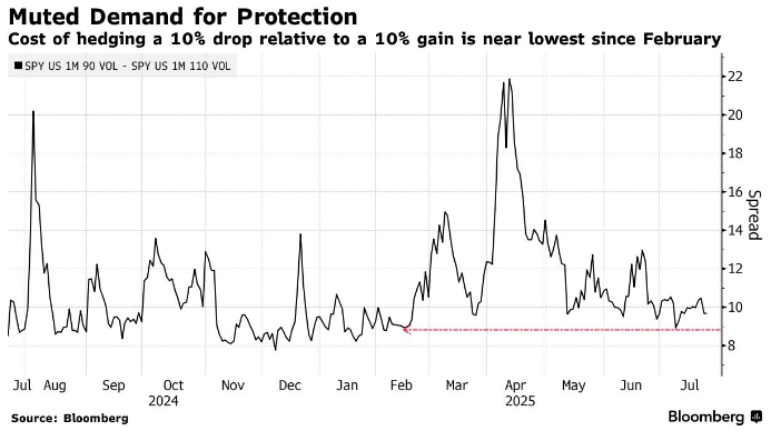 В таких условиях хеджирование от возможного снижения рынка становится более доступным. Стоимость защиты от 10%-ного падения в следующем месяце в биржевом инвестиционном фонде, который отслеживает индекс S&P 500, против 10%-ного роста находится на самом низком уровне с января.