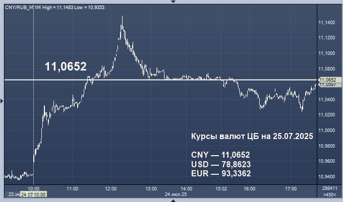 Росстат зафиксировал снижение потребительских цен в России за неделю с 15 по 21 июля до 0,05% после роста на 0,02% с 8 по 14 июля. Недельная дефляция в РФ зафиксирована впервые с начала сентября 2024 года. Годовая инфляция в РФ на 21 июля, исходя из расчетов на основе данных Росстата, замедлилась до 9,17% с 9,34% на 14 июля (и 9,40% на конец июня), если ее высчитывать из недельной динамики (такой методики придерживается ЦБ). К середине торгов четверга рубль перешел к ослаблению, в результате чего курс юаня обновил максимумы с конца мая.
