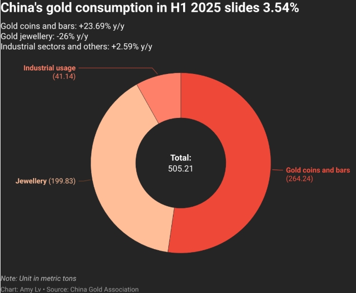 Потребление золота в Китае в первой половине 2025 года сокращалось более медленными темпами, поскольку высокий спрос на безопасные активы частично компенсировал снижение спроса со стороны производителей ювелирных изделий, которые страдают от высоких цен на драгоценный металл. По данным поддерживаемой государством Золотой ассоциации, закупки золота за первые 6 месяцев текущего года снизились на 3,54% в годовом исчислении до 505,205 метрических тонн по сравнению с годовым падением на 5,96% в первом квартале и падением на 5,61% за аналогичный период 2024 года.