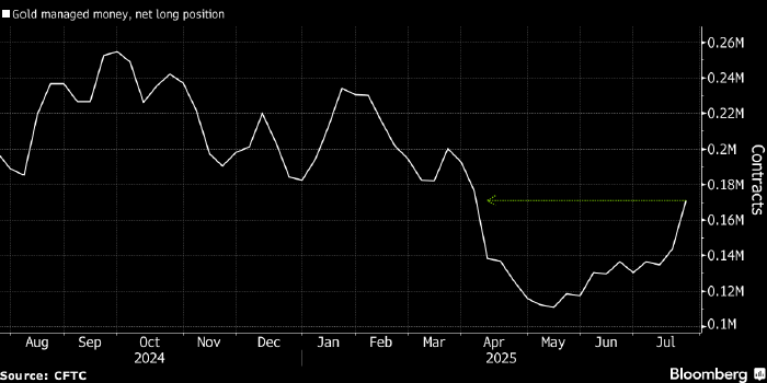 На неделе до 22 июля крупные спекулянты увеличили чистую длинную позицию во фьючерсах и опционах на золото сразу на 19% (рекордное значение с марта 2024 года), доведя ее до самого высокого уровня с прошлого апреля. Об этом вечером пятницы сообщила американская Комиссия по торговле товарными фьючерсами (CFTC).