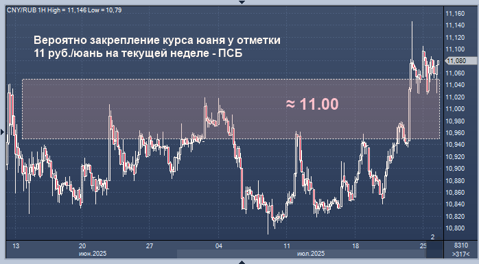 Вероятно закрепление курса юаня у отметки 11 руб./юань на текущей неделе, полагает управляющий эксперт Центра аналитики и экспертизы банка ПСБ Денис Попов.