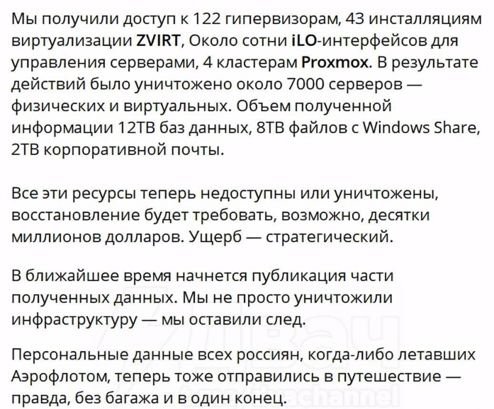 По их словам, операция длилась около 12 месяцев и завершилась, предположительно, полным разрушением внутренней ИТ-инфраструктуры компании. Согласно их информации, было уничтожено около 7000 физических и виртуальных серверов, а также получено более 20 терабайт данных.