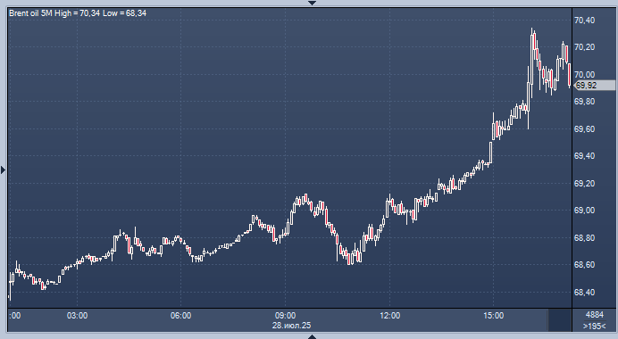 К 13:17 по Гринвичу стоимость фьючерсов на нефть марки Brent увеличилась на 2,4% или на 1,63 доллара за баррель и составила 70,07 доллара. Цена на американскую нефть марки West Texas Intermediate выросла на 2,5% или на 1,62 доллара за баррель и достигла 66,78 доллара.