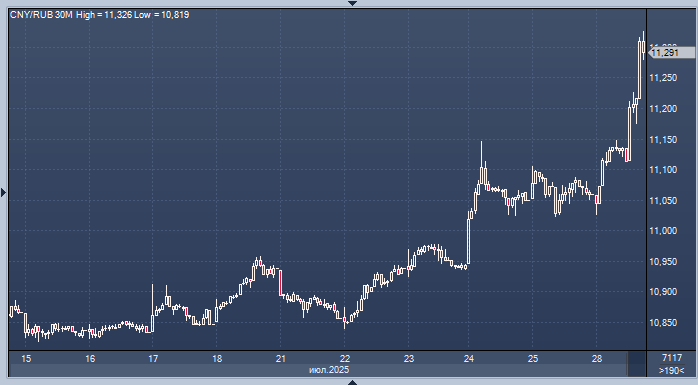 В ходе торгов на Московской бирже в понедельник курс китайского юаня поднялся выше отметки в 11,3 рубля — впервые с 8 мая.