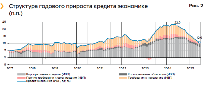 «Кредитование населения существенно замедлилось. Июньский прирост требований к населению составил менее 0,1%, за год требования банков к населению почти не изменились», — говорится в материале. — «Весь рост кредита экономике обеспечивали требования к организациям, за июнь возросшие на 0,4% против 1,4% месяцем ранее. Наибольший вклад в июньский прирост требований вносили рублевые кредиты и облигации. Как и в мае, рост кредитного портфеля банков обеспечивали преимущественно долгосрочные кредиты».