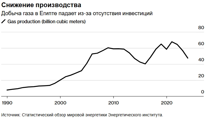 К 2024 году страна снова стала импортёром сжиженного природного газа. Общий объём добычи газа в Египте недавно упал ниже 4 миллиардов кубических футов в сутки, что произошло впервые с июля 2016 года.
