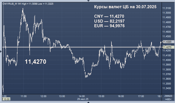 В Кремле приняли к сведению заявления президента США Трампа о том, что он сокращает отведенный им срок для достижения перемирия на Украине с 50 до 10-12 дней, а также о том, что больше не заинтересован в разговорах с российским коллегой Владимиром Путиным по украинскому урегулированию, заявил пресс-секретарь главы российского государства Дмитрий Песков. "Мы приняли к сведению вчерашние заявления президента Трампа. Продолжается специальная военная операция, и мы по-прежнему сохраняем нашу приверженность мирному процессу для урегулирования конфликта вокруг Украины и обеспечения наших интересов в ходе этого урегулирования", - сказал он журналистам. В ответ на просьбу прокомментировать слова Трампа о том, что ему больше неинтересны разговоры с Путиным об Украине, представитель Кремля заявил: "Я бы хотел избежать каких-то оценок. Еще раз повторяю, мы приняли к сведению заявления президента Трампа". "Давление на российскую валюту сейчас оказывает комбинация факторов - усилившиеся риски санкций, снизившаяся ключевая ставка ЦБ и сократившиеся на время продажи валюты экспортерами после завершения налогового периода. На валютный рынок повлиять мог и запрет на экспорт бензина до сентября. Сегодня курс пары CNY/RUB находится у отметки 11,4 руб./юань. В сложившихся условиях курс китайской валюты способен остаться выше 11,25 руб./юань до снятия санкционных рисков", - считает аналитик банка "Санкт-Петербург" Виктор Григорьев.