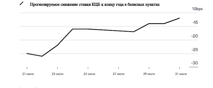 Экономисты Morgan Stanley придерживаются своего прогноза о снижении ставок на четверть пункта в сентябре и декабре. Между тем, через опционы на деривативы, привязанные к ставке фондирования Euribor, размещены ставки на получение более чем 10 млн евро ($11,4 млн) прибыли от снижения ставок на полпункта к концу года.