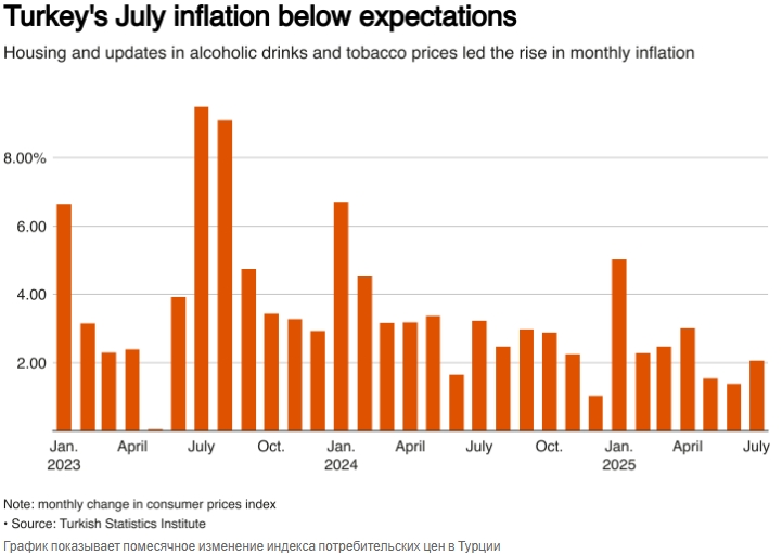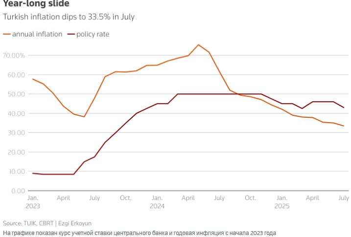 В июле в Турции произошло значительное снижение годовой инфляции потребительских цен, которая составила 33,52%, что ниже прогнозов. Об этом свидетельствуют официальные данные, опубликованные в понедельник. Тенденция к снижению инфляции сохраняется, несмотря на существенный рост цен в сфере недвижимости и образования.