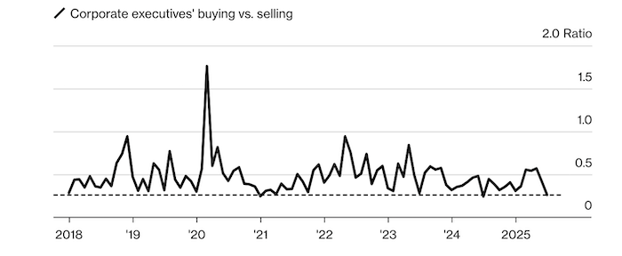 По данным, собранным Washington Service, инсайдеры всего в 151 компании из индекса S&P 500 покупали собственные акции в прошлом месяце — это наименьший показатель как минимум с 2018 года. И хотя темпы продаж инсайдеров в июле замедлились по сравнению с июнем, покупки сократились еще сильнее, в результате чего соотношение покупок к продажам достигло самого низкого уровня за год.