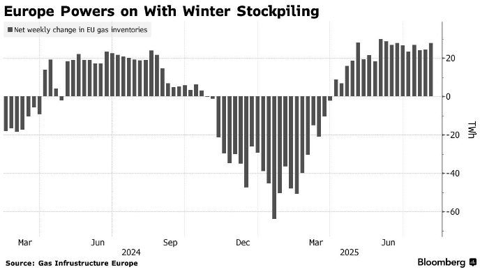 Европа активно готовится к зиме и стремится создать достаточные запасы газа. Последние данные Gas Infrastructure Europe показывают, что закачка газа в хранилища на прошлой неделе выросла больше всего с июня. Это помогает сдерживать цены, несмотря на то, что президент США Дональд Трамп усилил угрозу санкций против Индии за покупку российской нефти. Это усилило опасения по поводу приближающегося крайнего срока 8 августа, к которому Москва должна заключить перемирие с Украиной, иначе ей грозят экономические санкции.