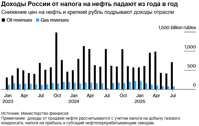 Согласно данным, опубликованным Министерством финансов во вторник, в июле налоги, связанные с нефтью, снизились почти на 33%, до 710,4 миллиарда рублей (8,9 миллиарда долларов). Совокупные доходы от нефти и газа составили 787,3 миллиарда рублей, что на 27% меньше, чем в прошлом году.
