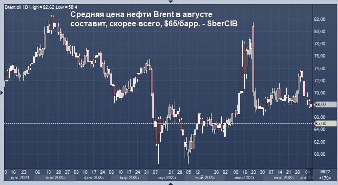 Средняя цена нефти Brent в августе составит, скорее всего, $65 за баррель, а золота - около $3350 за тройскую унцию, прогнозируют аналитики SberCIB Investment Research.