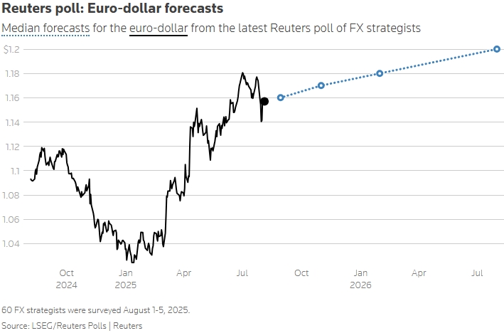 Опрос Reuters: прогнозы по евро/доллару. Медианные прогнозы по паре евро/доллар, полученные в ходе последнего опроса валютных стратегов, проведенного агентством Reuters. В опросе приняли участие 60 валютных стратегов, проводившихся с 1 по 5 августа 2025 года. Источник: опросы LSEG/Reuters | Reuters