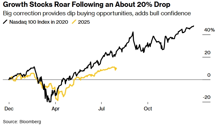 Рынок акций резко вырос после падения примерно на 20%. Большая коррекция создает возможности для покупок на спаде и добавляет уверенности быкам. Индекс Nasdaq 100 в 2020/2025 гг. Источник: Блумберг