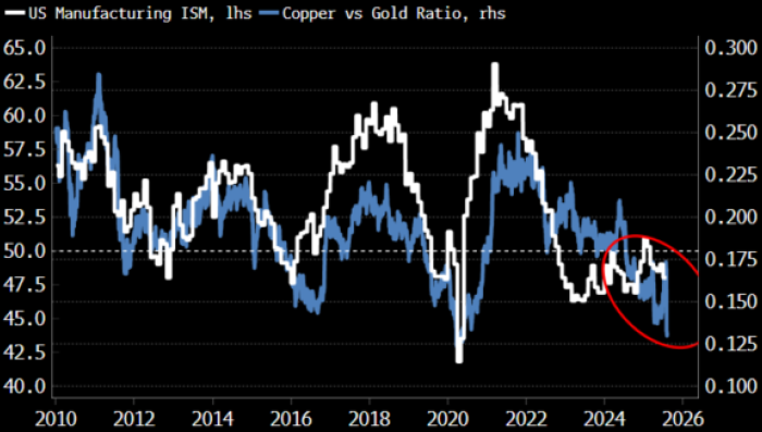 Кроме того, отношение цены меди к цене золота хорошо коррелирует с индексом PMI в. обрабатывающей промышленности США. И оба этих индикатора предрекают экономике страны слабость.