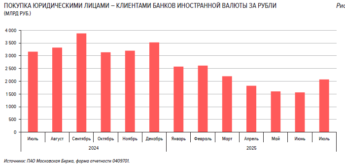 «На протяжении большей части месяца спрос на валюту со стороны юридических лиц — клиентов банков оставался в пределах значений предыдущего месяца. Однако в конце июля произошел всплеск спроса на валюту со стороны нефинансовых компаний, что могло способствовать ослаблению рубля», — говорится в обзоре. — «В последующие дни объем спроса стабилизировался на среднем уровне месяца. В целом суммарные покупки валюты юридическими лицами — клиентами банков в июле составили 2,1 трлн руб., увеличившись на 32% относительно предыдущего месяца».