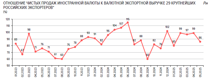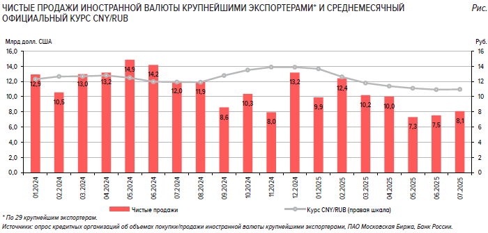 Физлица также проявили повышенный спрос на валюту: объем их нетто-покупок подскочил в июле на 53% м/м до 119,5 млрд руб., превысив среднемесячный показатель за 2025 г. в 83,4 млрд руб. При этом равномерное распределение продаж иностранной валюты экспортерами помогло сгладить колебания валютных курсов.