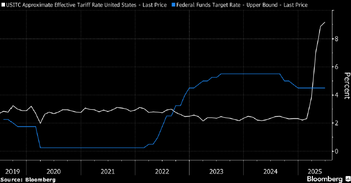 Белым — примерная эффективная ставка на импорт в США, голубым — ставка по федеральным фондам. Источник: Bloomberg