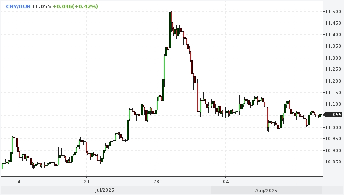 Юань на биржевых торгах во вторник, 12 августа подорожал к рублю на 0,2%, до 11,032. Курс рубля до конца августа продолжит колебаться в диапазоне 11,0–11,4 руб./юань и 80–83 руб./$1, полагают эксперты инвестиционного банка «Синара» Сергей Коныгин и Александр Афонин.