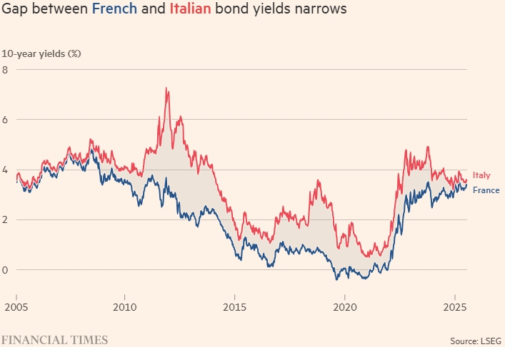 Разрыв между доходностью французских и итальянских облигаций сокращается. Доходность 10-летних облигаций (%). Италия. Франция. FT. Источник: LSEG