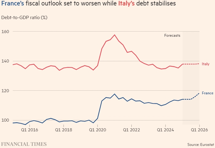 Бюджетные перспективы Франции ухудшатся, в то время как долг Италии стабилизируется. Соотношение долга к ВВП (%). FT. Источник: Евростат.