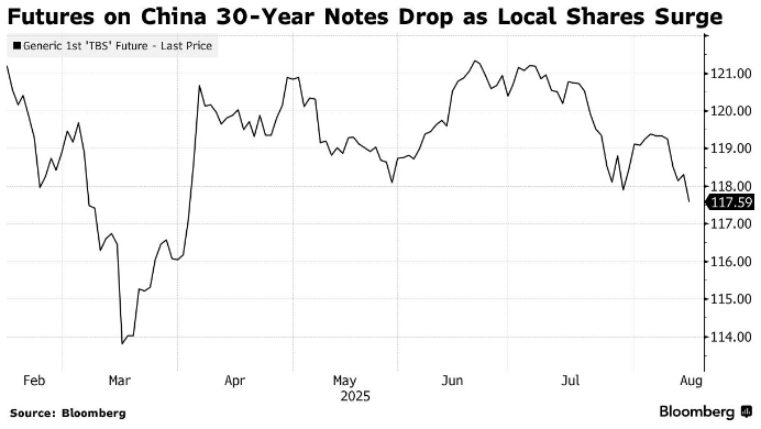 На китайском рынке облигаций наблюдается ускорение распродаж, что привело к снижению цен на фьючерсы на сверхдлинные облигации до четырёхмесячного минимума. Это происходит на фоне роста местных акций, который набирает обороты.