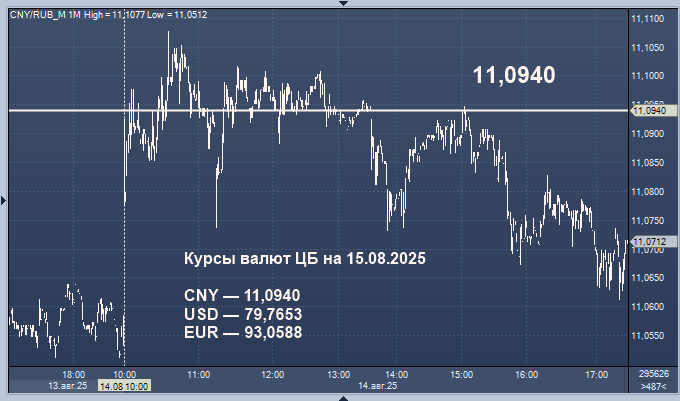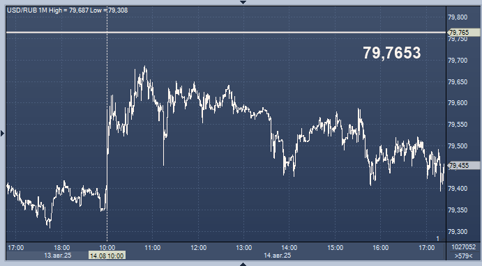 Китайский юань немного укрепляется на Московской бирже днем в четверг; рубль опускается в ожидании встречи президентов России и США Владимира Путина и Дональда Трампа, которая пройдет в пятницу, 15 августа, на Аляске, пишет Интерфакс.