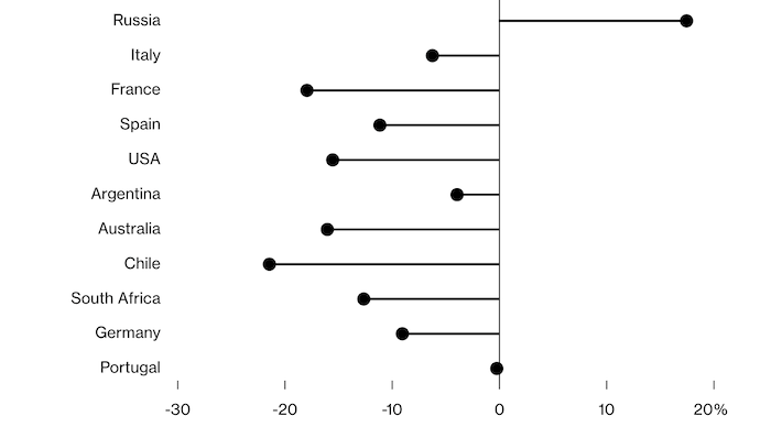Как изменился объем производства вина в России и в мире за последние пять лет. Источник: Bloomberg