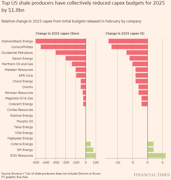 Американские производители сланцевой нефти приостанавливают работу буровых установок и сокращают расходы, чтобы защититься от падения цен, вызванного действиями ОПЕК. Крупнейшие производители сланцевой нефти в США в совокупности сократили бюджеты капитальных затрат на 2025 год на 1,8 млрд долларов. Относительное изменение капитальных затрат на 2025 год по сравнению с первоначальным бюджетом, опубликованным компанией в феврале. Изменение капитальных затрат в 2025 году (млн долл. США). Изменение капитальных затрат в 2025 году (%). Источник: Enverus. *Список производителей сланцевой нефти не включает Chevron и Exxon. Графика FT: Ева Сяо