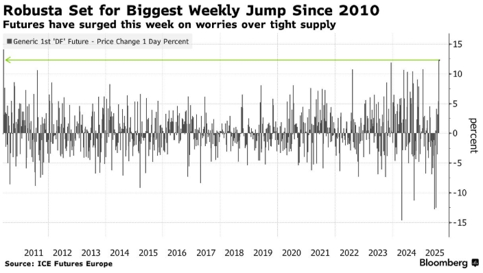 Фьючерсы на кофе робуста выросли на 1,5%, но затем рост замедлился, однако за неделю они всё равно выросли примерно на 12%. Это максимальный показатель с июня 2010 года.