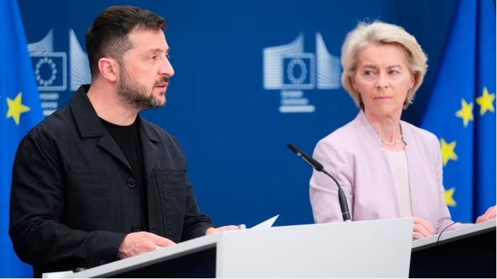 Президент Украины Владимир Зеленский, слева, с президентом Европейской комиссии Урсулой фон дер Ляйен в Брюсселе в воскресенье © AP