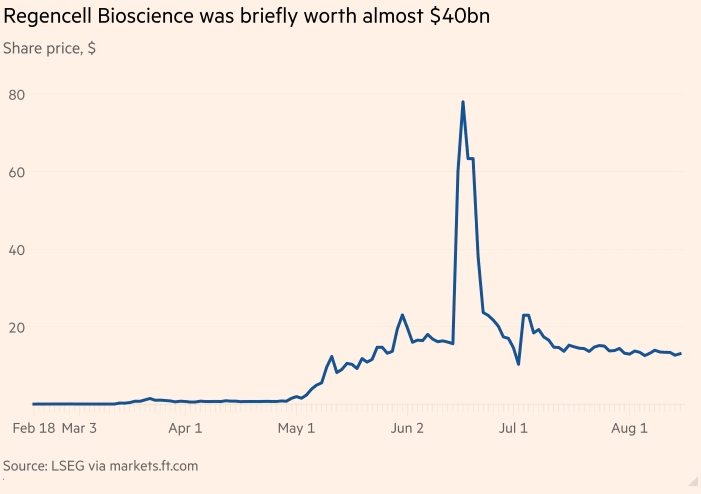 К 17 июня акции китайской компании по производству лекарственных трав Regencell Bioscience, которая в 2024 году сообщила о чистом убытке в размере 4,4 млн долларов, выросли почти на 60 000 % за год, в результате чего рыночная стоимость компании составила около 38 млрд долларов, что больше, чем у Jefferies и Walgreens вместе взятых.
