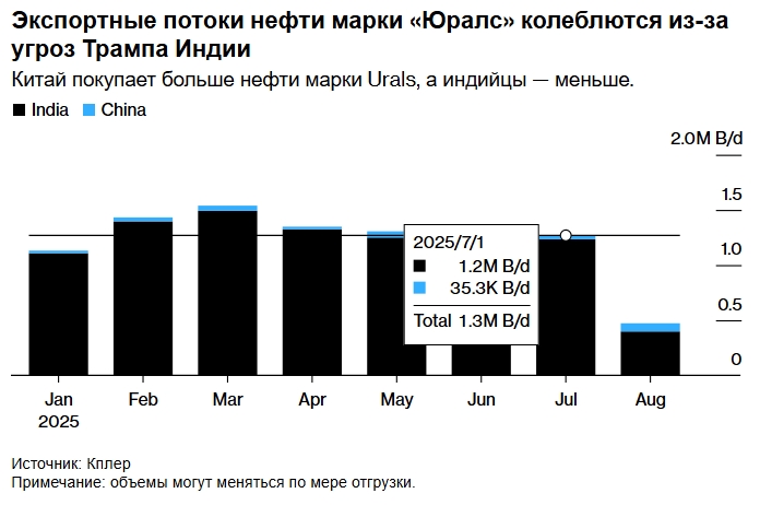 Хотя Китай является крупнейшим импортёром российской нефти, обычно он закупает её на Дальнем Востоке. Однако в августе поставки нефти марки Urals из портов Балтийского и Чёрного морей составили почти 75 000 баррелей в день. Это почти вдвое больше среднего показателя за год, который составляет около 40 000 баррелей. В то же время экспорт в Индию в этом месяце снизился до 400 000 баррелей в день по сравнению со средним показателем в 1,18 миллиона.