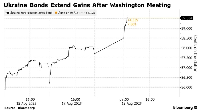 Несмотря на сохраняющиеся препятствия на пути к устойчивому мирному урегулированию, долларовые облигации Украины лидировали по темпам роста среди развивающихся рынков, согласно данным Bloomberg. Долларовые облигации с нулевым купоном и сроком погашения в 2036 году выросли пятый день подряд, превысив 59 центов за доллар, что является самым высоким показателем с конца марта.