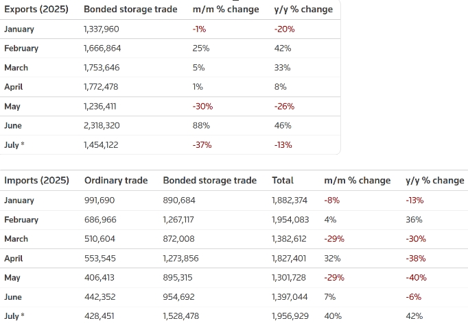 Экспорт в основном включает продажи малосернистой нефти для бункеровки вдоль побережья Китая. Импорт включает в себя обычные торговые операции, которые облагаются импортными пошлинами и налогом на потребление, а также импорт на таможенные склады.