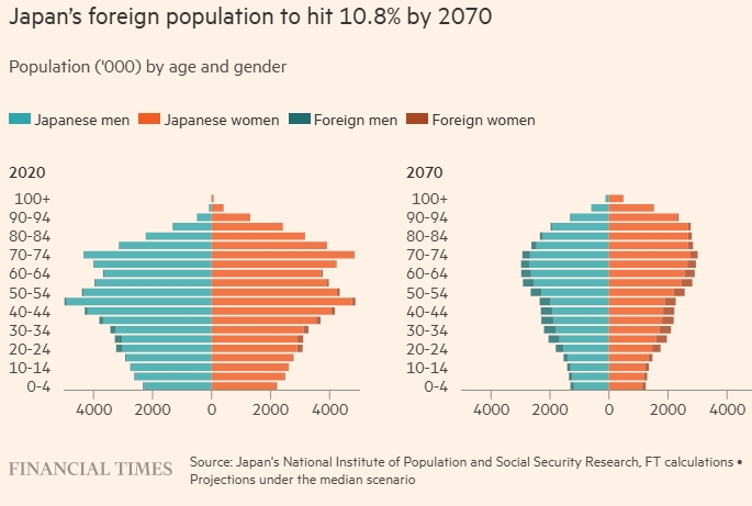 К 2070 году доля иностранного населения в Японии достигнет 10,8%. Население (тыс.) по возрасту и полу. Японские мужчины, японские женщины. Иностранные мужчины, иностранные женщины. FT. Источник: Национальный институт исследований народонаселения и социального обеспечения Японии, расчёты Financial Times. Прогнозы основаны на медианном сценарии.