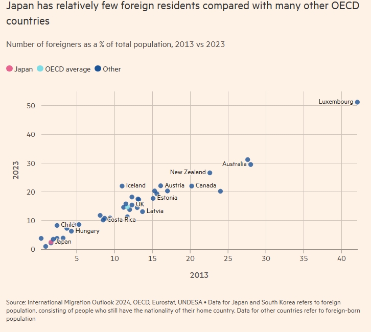 В Японии проживает относительно немного иностранцев по сравнению со многими другими странами ОЭСР. Количество иностранцев в % от общей численности населения, 2013 г. по сравнению с 2023 г. Япония. Средний показатель по ОЭСР. Другой. Люксембург. Чили. Венгрия. Исландия. Коста-Рика. Великобритания. Новая Зеландия. Австралия. Австрия. Эстония. Канада. Латвия. Япония. 2013 год. Источник: «Международный миграционный прогноз 2024», ОЭСР, Евростат, ДЭСВ ООН. Данные по Японии и Южной Корее относятся к иностранному населению, состоящему из людей, сохраняющих гражданство своей страны. Данные по другим странам относятся к населению, родившемуся за пределами страны.
